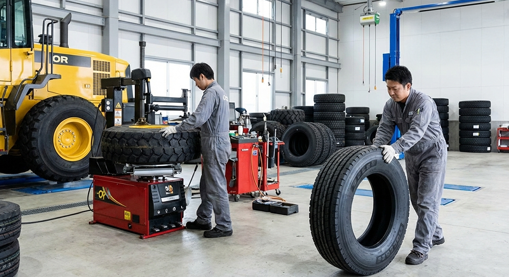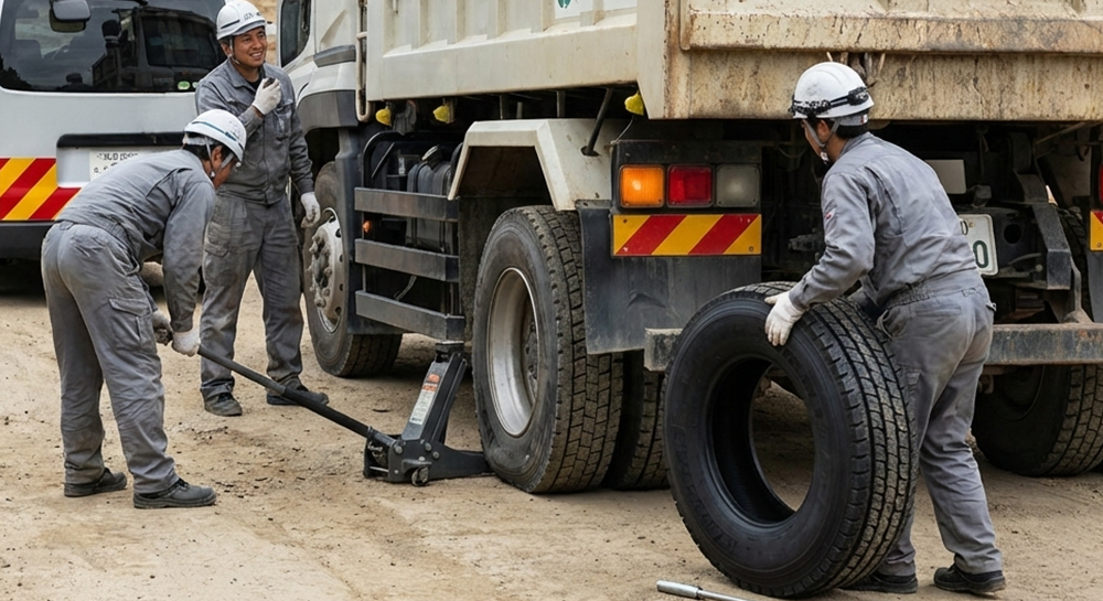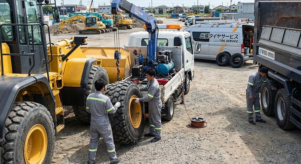 現場へ直行、即座に対応。トラック・重機の足元を支えるプロフェッショナル。大型・ORタイヤの出張交換から予防整備まで、御社のビジネス継続をサポートします。